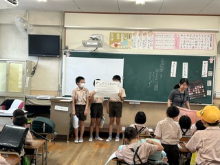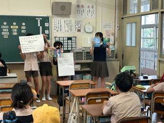 朝読書の時間に、読書委員会の児童が夏休みの読書感想文の課題の呼びかけを行いました。課題図書の紹介や、どういう風に感想文を書くかなど、丁寧に伝えていました。