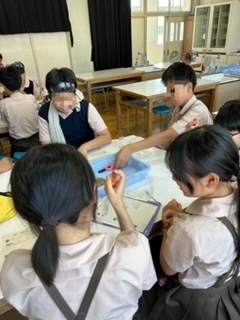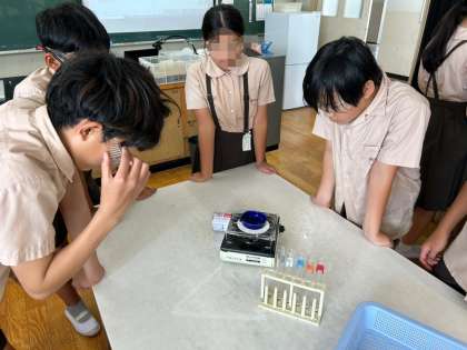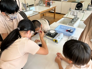 6年生、理科の実験の様子です。うすい塩酸やアンモニア水など危険な薬品も扱うので、みんな安全に気をつけて実験を進めていました。とても真剣に取り組んでいましたよ!