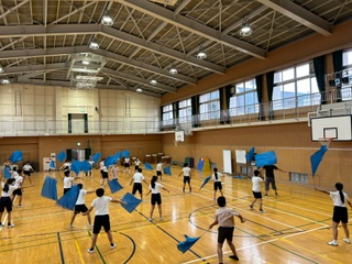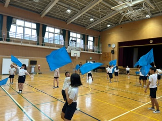 六年生、体育科の様子です。体育発表会に向けていよいよフラッグの練習も始まりました!青色のフラッグが揃って動く迫力、音はなかなかなものです!まだ練習も始まったばかりですが、みんな一生懸命練習していて、どんどん上手くなっています!