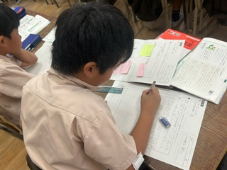 中の写真は、四年生国語科の学習の様子です。自分で書いたメモを元に「自分の気持ちがより伝わる」よう練習原稿を書きました。「はじめ、中、おわり」など、文章の組み立てからよく考えていました。