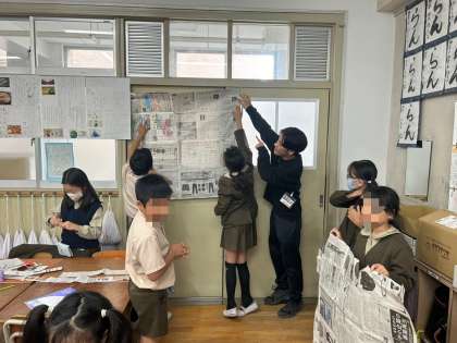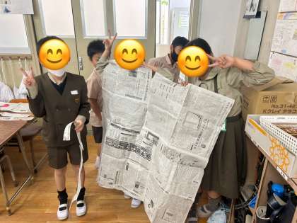 四年生、算数科の様子です。「1?の大きさを調べよう」という問題で、新聞紙を切り貼りして、班ごとに1?の大きさをつくりました!