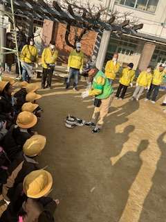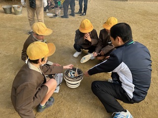 三年生、昔の生活体験で七輪を使っておもちを焼きました!見守り隊の方や地域の方を先生として招いて、火の起こし方などを教わりました。
