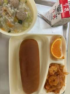今日の給食は、黒糖パン、エビのチリソースいため、中華がゆ、デコポンでした。