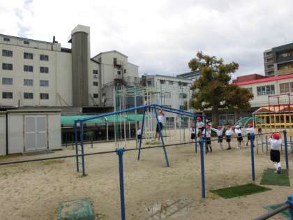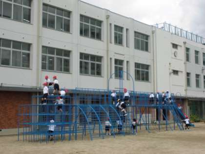 今日は、1年生で初めての体育がありました。小学校の遊具で思い切り体を動かしていました。楽しそうな声や笑顔がいっぱいでした。うんていが人気で行列ができていました。