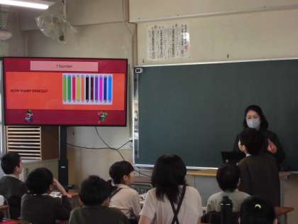 5・6年生では、今年も火曜日にはエレノア先生と英語の学習をします。5年生では、「How many 〜?」とゲームをしながら楽しく学習していました。