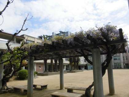 東中本小学校には、藤棚があります。暑い日には、日影ができ、ベンチに腰を下ろして、体育を見学したり休み時間を過ごしたりする児童も少なくありません。そんな藤棚に藤の花がきれいに咲いています。管理作業員さんが、毎年きれいに剪定してくれているおかげもあり、とても見事です。