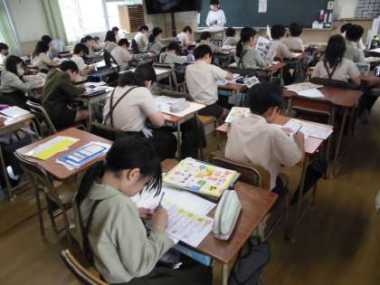 5年生の教室では、新出漢字について、みんなで確認し、ドリルに新出漢字を書いていました。教室は静まり返り、集中力が感じられました。