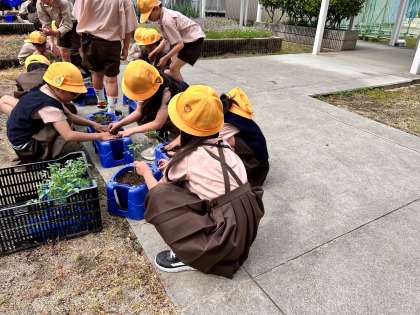 また、1・2年生が、あさがおやミニトマトの鉢植えをしました。きれいな花やおいしいミニトマトができるといいですね。たくさんお水をあげて、お世話がんばります!!