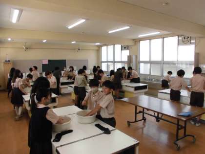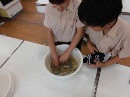 今日は、6年2組が家庭科の時間に靴下の洗濯をしました。