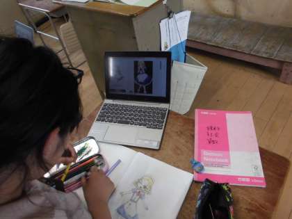 イラスト・まんがクラブでは、好きなキャラクターやオリジナルキャラクターなど、好きな絵を描いています。上手な子どもたちばかりで感心します。