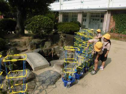 今日も朝から暑かったですが、1年生は、朝のMission「アサガオのお水やり」を行っていまいした。花がきれいに咲いていてうれしそうです。まだ、咲いていない児童ももうすぐかな?と楽しみにしています。