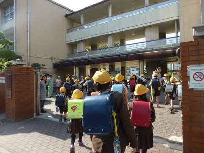 玄関に立ってくれているのは前年度の代表委員の児童です。