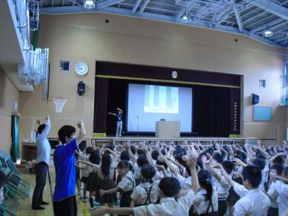 今日の、朝の児童集会で土曜日に予定されている「幼稚園創立50周年式典、小学校講堂竣工式」の式典2部で披露する歌の練習をしました。