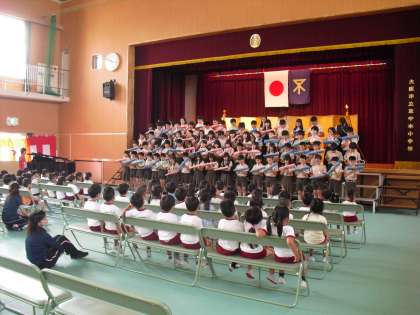 今日は、明日の式典練習を、幼稚園と合同で実施しました。2部構成の1部の練習です。