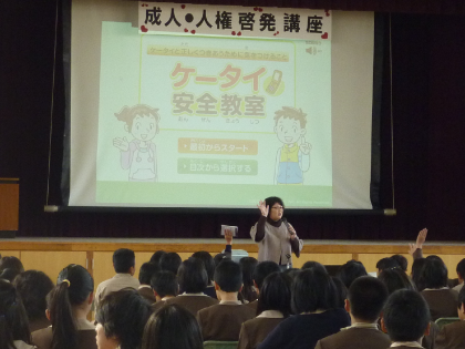 5・6年生は3時間目に講堂で「ケータイ安全教室」の出前授業を受けました。