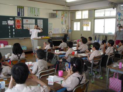 歯を、赤い染め出し剤で染めて、自分の歯の磨き方で、よく磨けているところ、うまく磨けていないところを調べます。