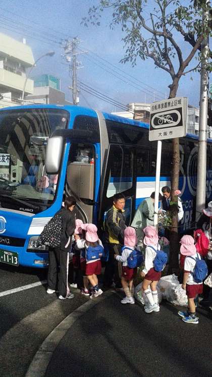 さあ、バスに乗って出発です。 ハーベストの丘で、おいもほりです。