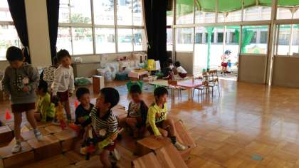 さくら組の子どもたちも、大積木を自分達で運び、ままごとと、繋げた遊びが広がっています。