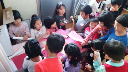 今日は、森のパン屋さんをイメージして、木をつくるそうです。相談中(さくら組)