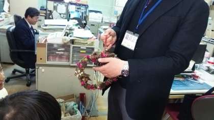 子どもたちが、つくった芋のリースを園長先生にプレゼント。。