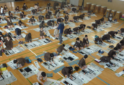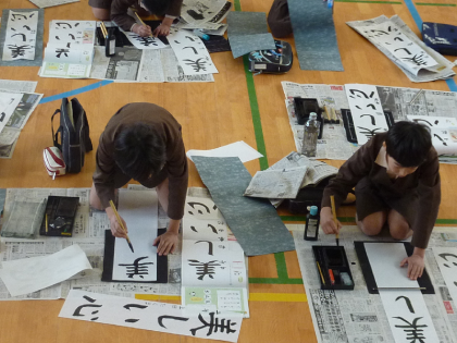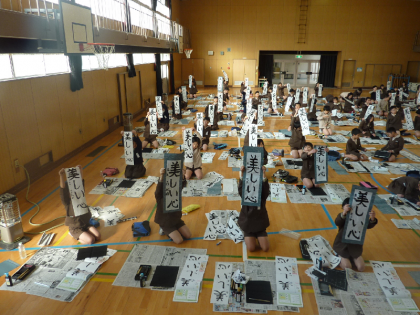 5年生は、今日(14日)講堂一面に広がって、書初めに挑戦しました。