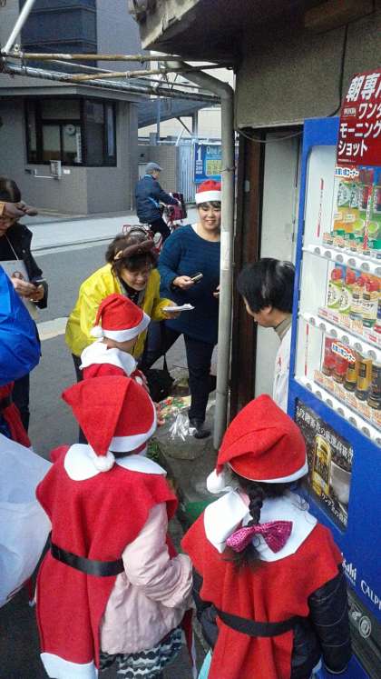 日頃、プレゼントをもらう側の子どもたちが、地域のお年寄りに、プレゼントを渡します。