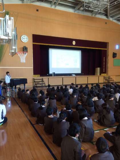 今日は、消防局の皆さんや、区役所の皆さんの協力を得ての防災訓練でした。まず、講堂で津波についてのDVDを見て、地震についての学習をしました。
