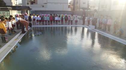 土日の寒さにプールが凍っていました。朝の安全点検で職員が見つけました。それを子どもたちに知らせると、氷の厚みに驚き、触って「冷た〜い」と歓声をあげていました。
