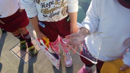 さぁ、保育室にもって入ってその氷がどうなるか、実験です。「日陰においといた方がいいよ」と子どもの一言。楽しい保育の展開がありました。