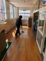 赤ずきんがお母さんのお手伝いをしてるところで、雑巾がけをしています。