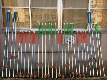 集まったベルマークでを大中小の竹馬20組と整理棚購入させていただきました。