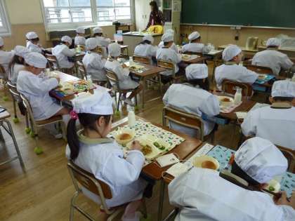 写真は初めての給食の日の1年生の様子です。あのときよりも準備も喫食も片付けも、ずいぶん上手になっているようです!
