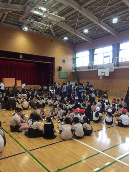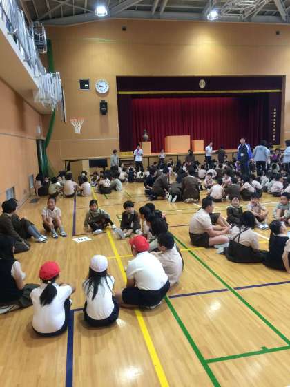 今日の児童集会は、1年生から6年生までの縦割り班の太陽グループの編成です。