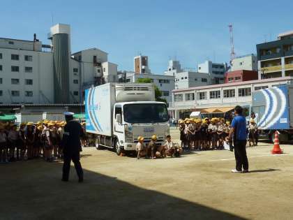 今年は大きなトラックを3台校庭に入れていただき、運転手さんからの死角や大きなトラックの内輪差など、子ども達からは気づきにくい危険箇所を教えていただきました。