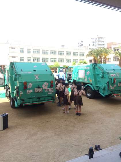今日は、大阪市環境事業局から、パッカー車を2台派遣していただき、社会科の体験学習を実施しました。