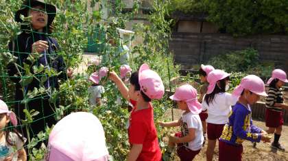 小学校の、管理作業員さん、幼稚園の管理作業員さんが植えて育てていたスナックエンドウを収穫させてもらいました。