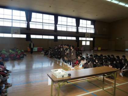 2月24日(月)、本校の講堂に、東中本幼稚園、東中本保育園の来年1年生になる子どもたちを招待して、交流会が開かれました。