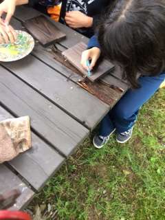 焼き板に絵を描いています。