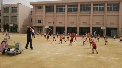 元気に入場し、体操してから、さくら組のかけっこです。間隔をあけて歩いたり、音楽に合わせて行進したりすることができるようになってきました。