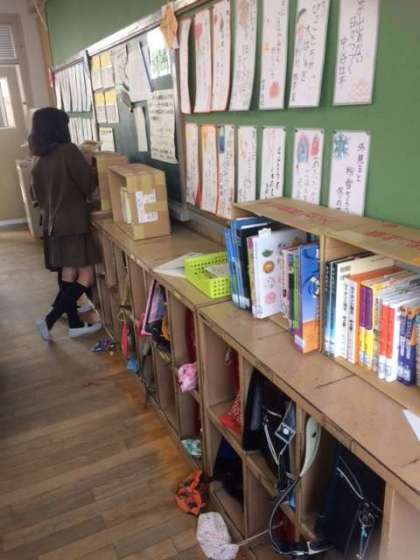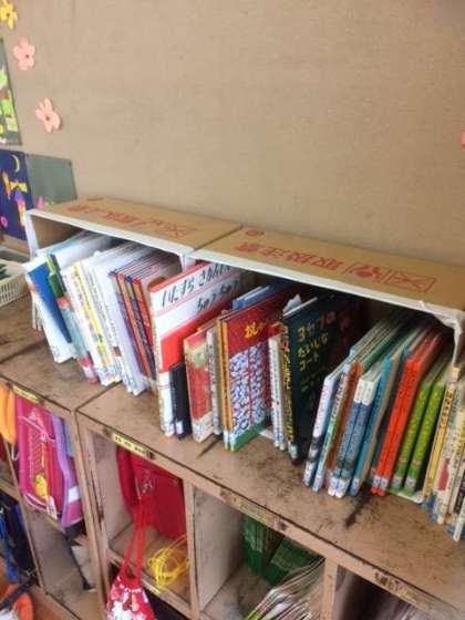 まだ、書架が届いていませんので、ダンボール箱を工夫して書架にしています。読書好きの子どもになってほしいと願っています。