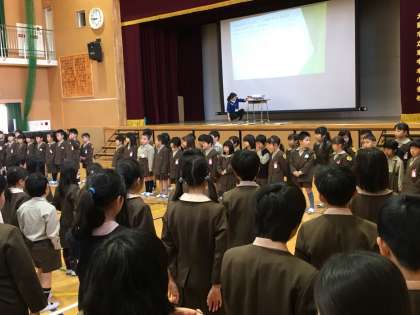 今朝、講堂で児童会主催の一年生を迎える会が開かれました。