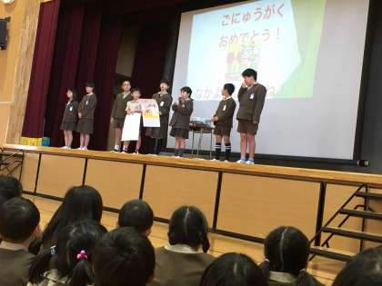 全校児童でお迎えをして、元気に歌を歌ったり、学校クイズをしたり、じゃんけん大会をしたりしました。