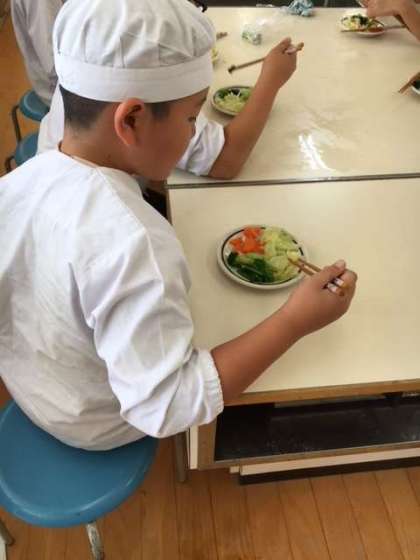 5年生は今日、家庭科室で「カラフルゆで野菜サラダ」を作りました。
