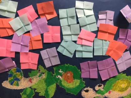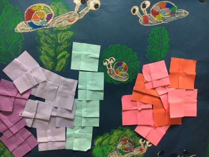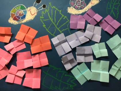 梅雨の季節に合わせて、1年生は折り紙でアジサイを折りました。カタツムリと葉っぱはどんな色がいいかなと考えて、クレパスで描きました。