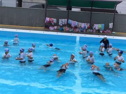 初めて衣服を着たままプールに入った2年生の子供達はその重さに驚いていました。