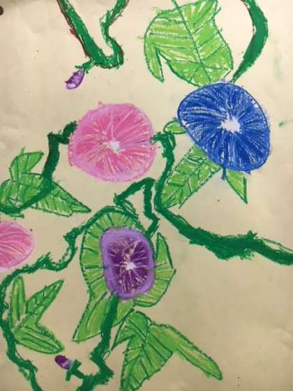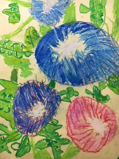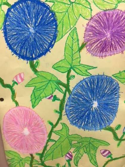 一年生の育てた朝顔が毎日たくさんの花を咲かせていますが、その朝顔の絵をクレパスで描きました。教室も朝顔の花で満開です。