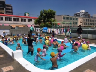 今日は、幼保プール交流がありました。そらぐみとぞうぐみが一緒にプールに入り、水を掛けあったりグルグル洗濯機で水流を感じたり、存分に水の気持ち良さを味わいました。
