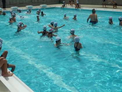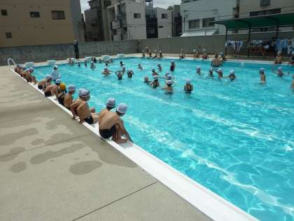 写真は今年一番にプールに入った2年生の子どもたちです。
