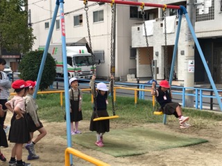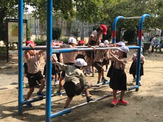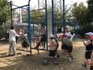 1年生全員で神路公園と東中本公園に遊びに行きました。生活科の学習です。友だちと遊具で遊んだり、鬼ごっこをしたり、虫探しをしている子もいます。譲りあって、仲良く遊んで楽しみました。