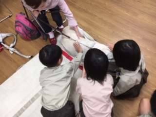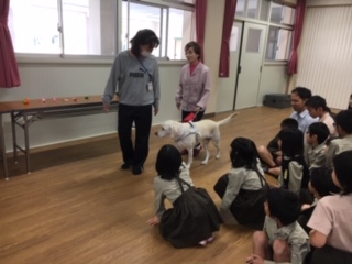 3年生は今日講師の先生をお迎えして、盲導犬の仕事について学習しました。目の不自由な山本さんを助けて盲導犬がどんなふうにお仕事をするのかを、お話を聞いたり、ビデオや実際の動きを見たりして学びました。最後にはハーネスを外してもらったフェリシアちゃんと触れ合う時間も取っていただき、温かい交流もできました。